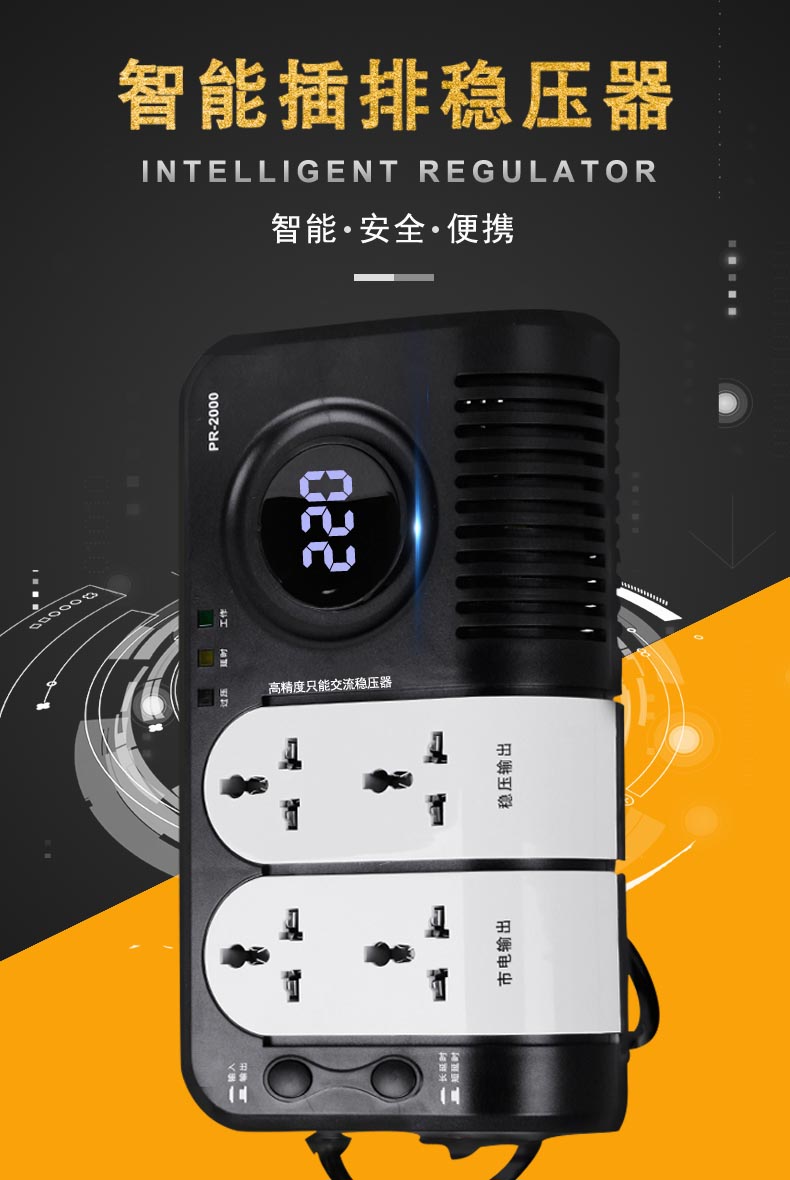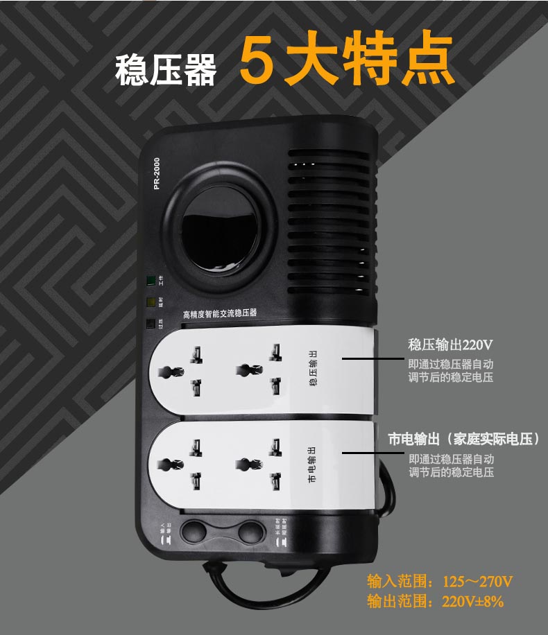 產(chǎn)品簡介: PR-2000系列是我公司新開發(fā)的一款全自動智能型便攜式穩(wěn)壓器,為滿足日益增加的便攜式電源的需求而設(shè)計,該穩(wěn)壓器擁有緊湊和時尚的外觀,蜂鳴報警、智能過載保護等功率。 適用于1000W以下的負(fù)載設(shè)備,如電腦、電視、冰箱、麻將機等小功率家電設(shè)備和數(shù)碼產(chǎn)品。