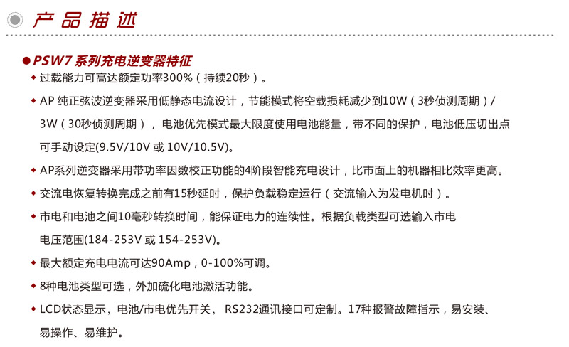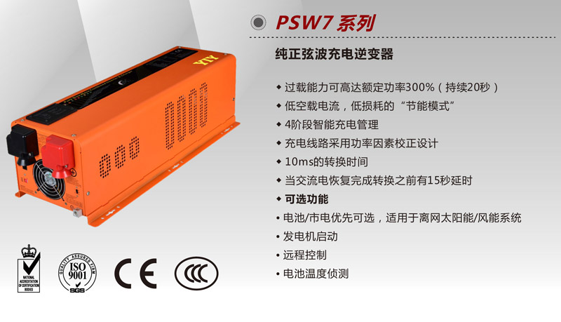 PSW7系列純正弦波逆變器集合逆變器,充電機和自動交流轉換開關為一體的多功能逆變器,轉換效率可高達88%。